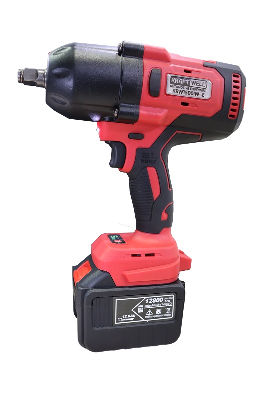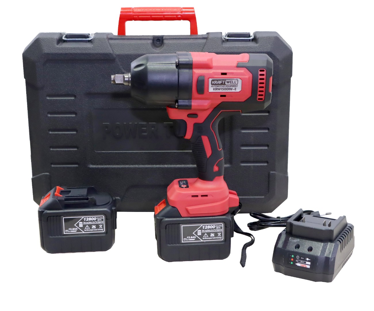 Аккумуляторный гайковерт KRAFTWELL, модель KRW1500IW-E с ударным механизмом развивает крутящий момент 1500 Нм. Размер посадочного квадрата составляет 1/2”, что позволяет работать с ударными головками от 10 до 27 мм. Поставляется в удобном пластиковом кейсе для переноски. В комплекте с гайковертом поставляются 2 аккумулятора емкостью 12,8 Ah каждый и зарядное устройство.
