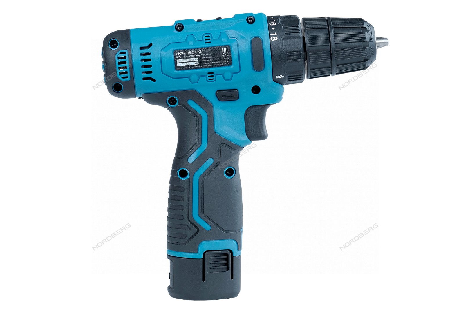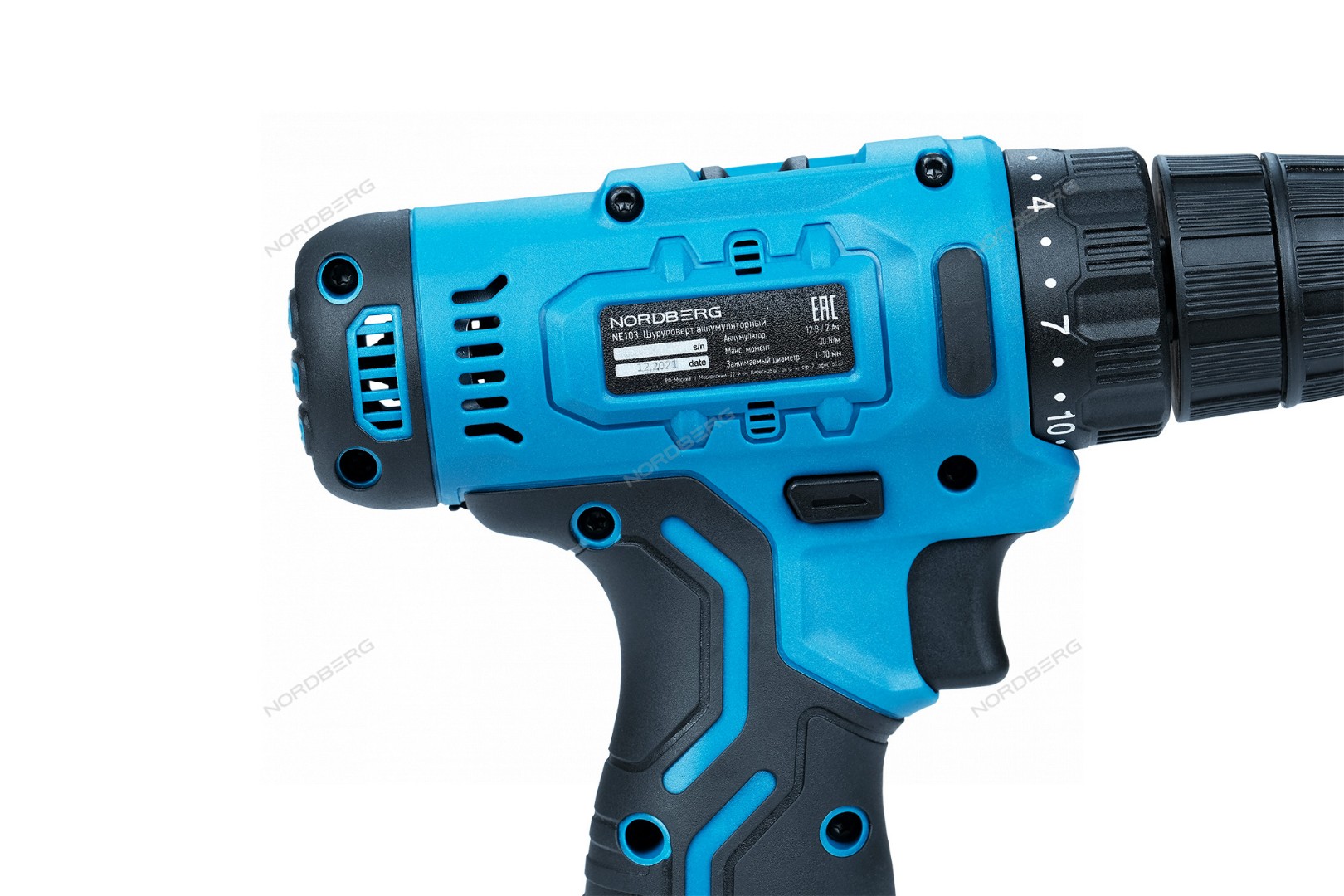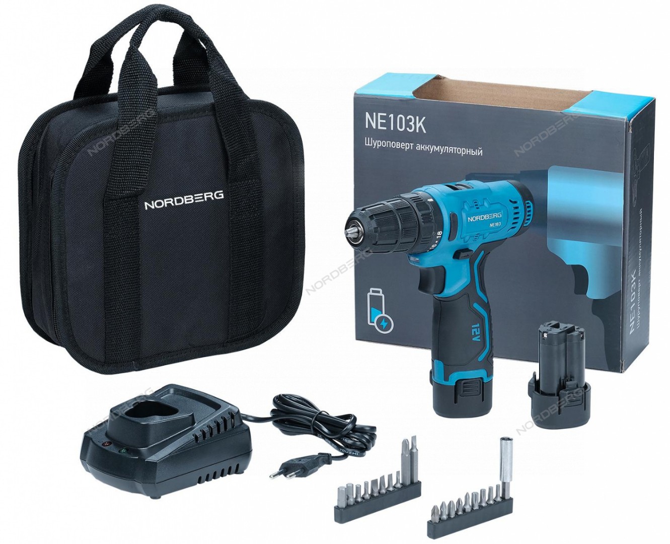 Описание NE103K+NE9012 Nordberg Шуруповерт аккумуляторный макс Ø сверла 10мм, 12В, 30Нм с 2 аккумуляторами и зарядным устройством: