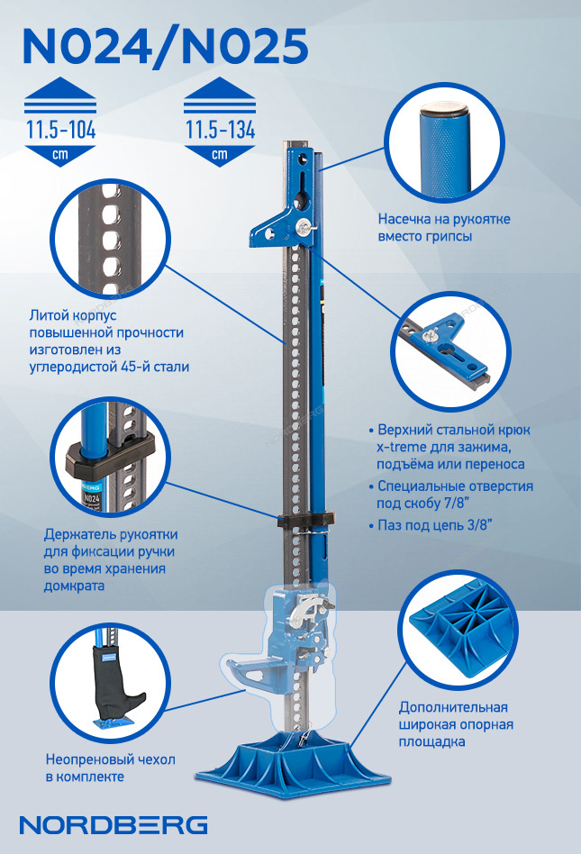 Реечный домкрат 3,5 т с держателем рукоятки и опорой в комплекте, 153 см Nordberg N025 характеристики