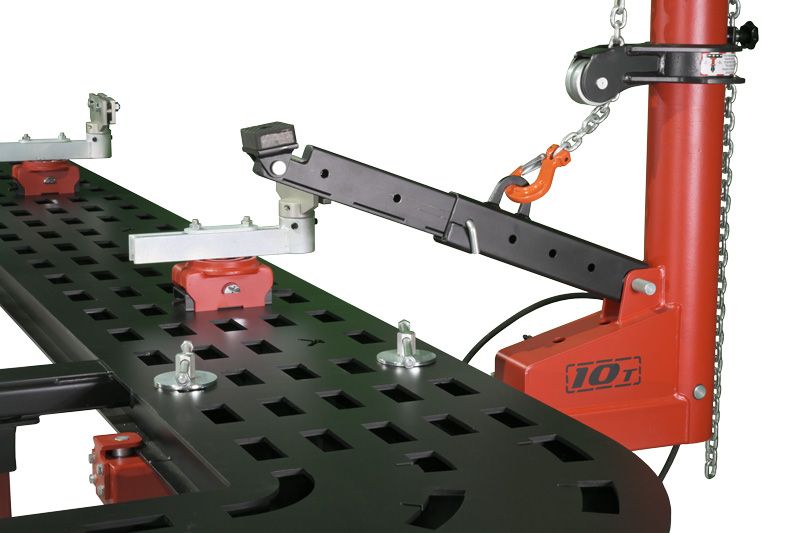 Для создания максимальных тяговых усилий стенд комплектуется силовыми устройствами башенного типа с телескопическим толкателем и встроенным внутрь гидроцилиндром прямого действия. Силовое устройство способно свободно перемещаться вокруг платформы на роликовом механизме и крепиться в любой точке платформы с помощью резьбового фиксатора без лишних люфтов и зазоров, обеспечивая дополнительную жесткость в точке сопряжения с платформой. Оборудование изготовлено из прочной стали и имеет мощную и надежную конструкцию. Настенный перфорированный стенд, входящий в базовую комплектацию позволяет разместить зажимы и аксессуары в комфортном для сотрудника месте, не ограничивая перемещение в рабочей зоне.