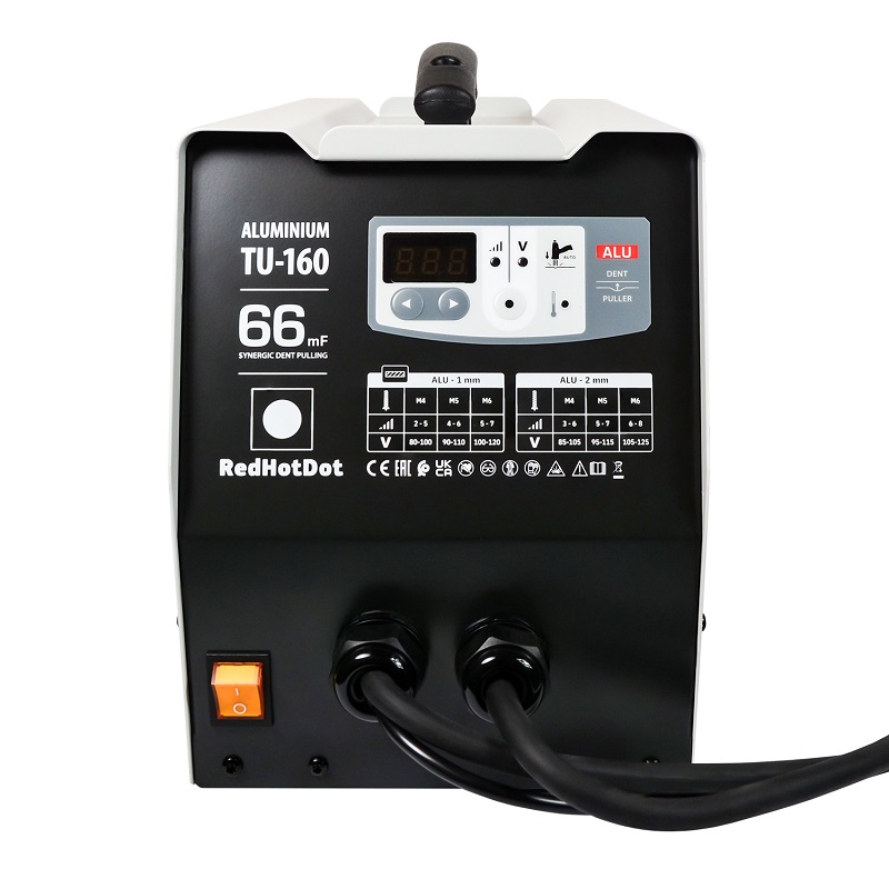 Споттер ALUMINIUM TU-160 предназначен для рихтовки алюминиевых деталей кузова с использованием шпилек M4, M5 и M6 (последние 2 - опция). Пистолет с автоматическим запуском сварки и разряд мощного конденсатора всего за 3 миллисекунды приварят шпильки для устранения вмятин и следов ударов на панелях, капотах и т.д.