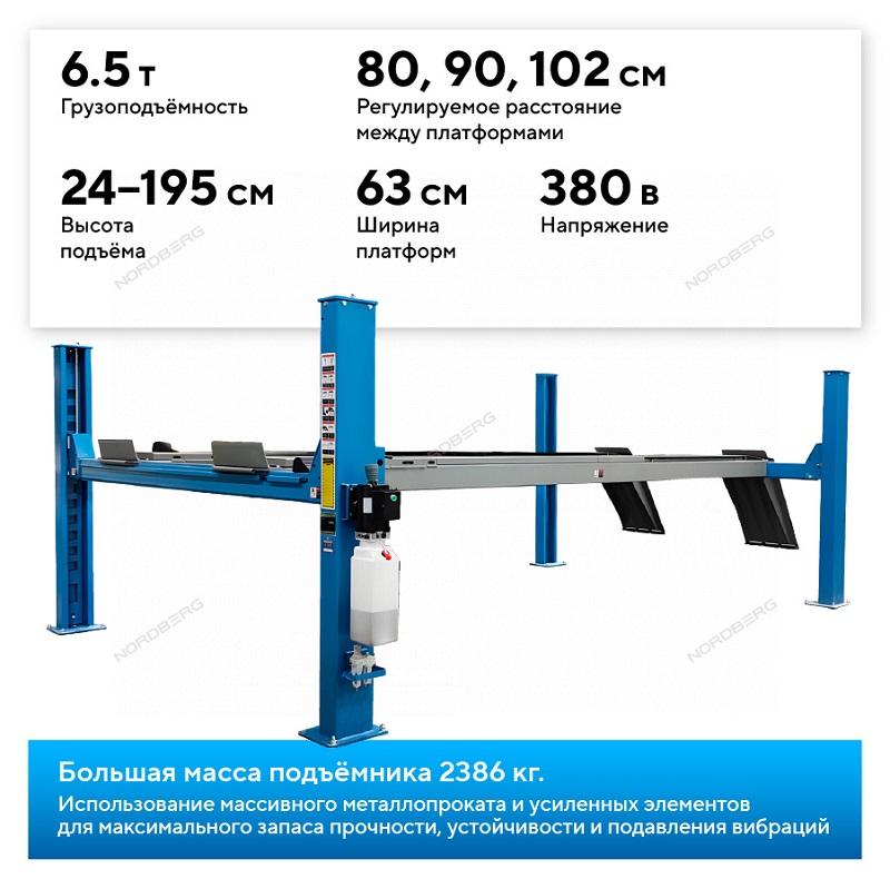Электрогидравлический четырехстоечный подъемник г/п 6,5 т 380 В Nordberg 4465B характеристики