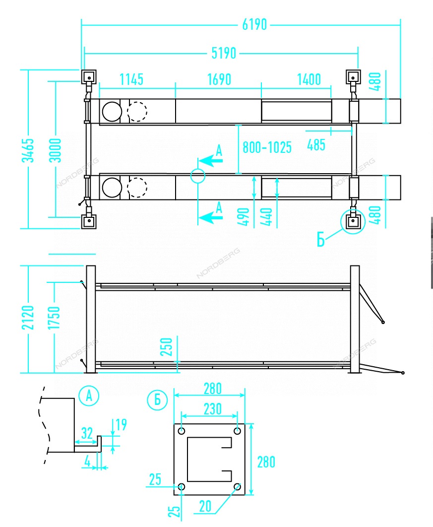 Подъемник четырехстоечный 5 т, без траверсы, для сход-развала Nordberg 4450_MG характеристики