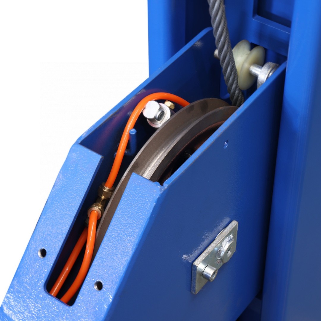 - Надёжная система безопасности: механические и пневматические стопоры фиксируют платформу по уровням и предотвращают падение при обрыве или ослаблении троса.