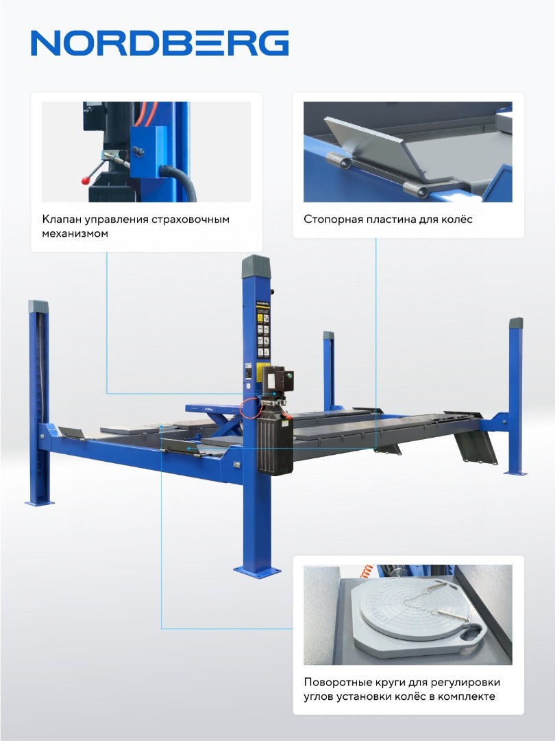 NORDBERG 4455JAB — это надёжный и функциональный четырёхстоечный подъемник, удобный в эксплуатации и предоставляющий расширенные возможности для профессионального сход-развала. Идеален для СТО и сервисных центров, где важны точность, безопасность и эффективность работы.