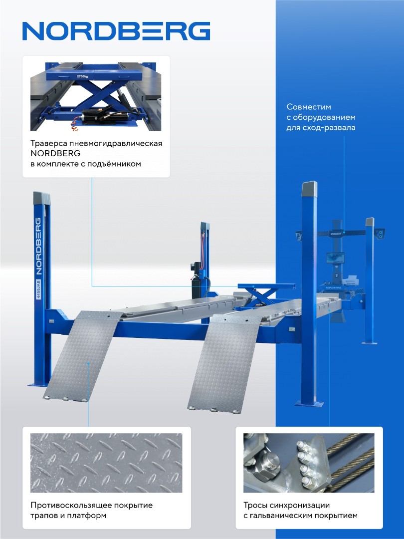 Подъемник четырехстоечный 5.5 т, с траверсой 2.7 т, для сход-развала Nordberg 4455JAB характеристики