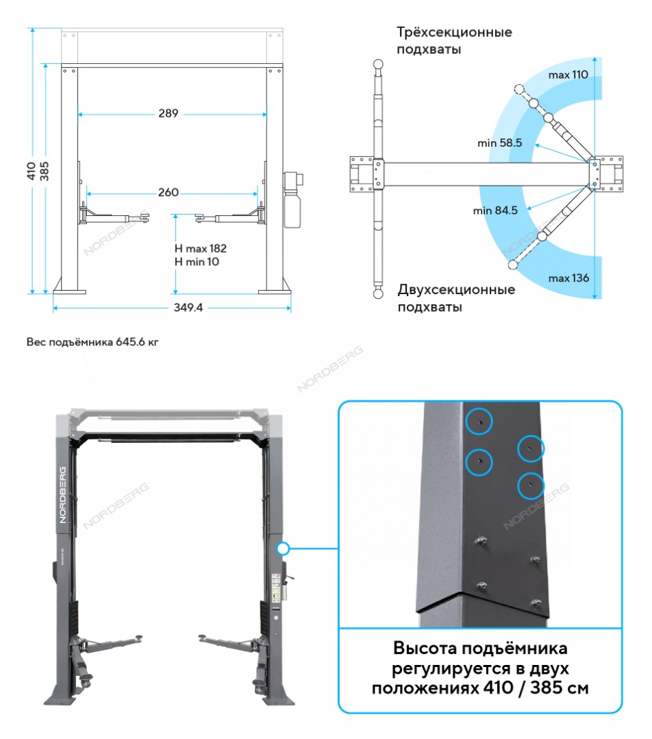 Электрогидравличекий двухстоечный подъемник г/п 4000 кг. Nordberg N4124H1-4G_380 характеристики