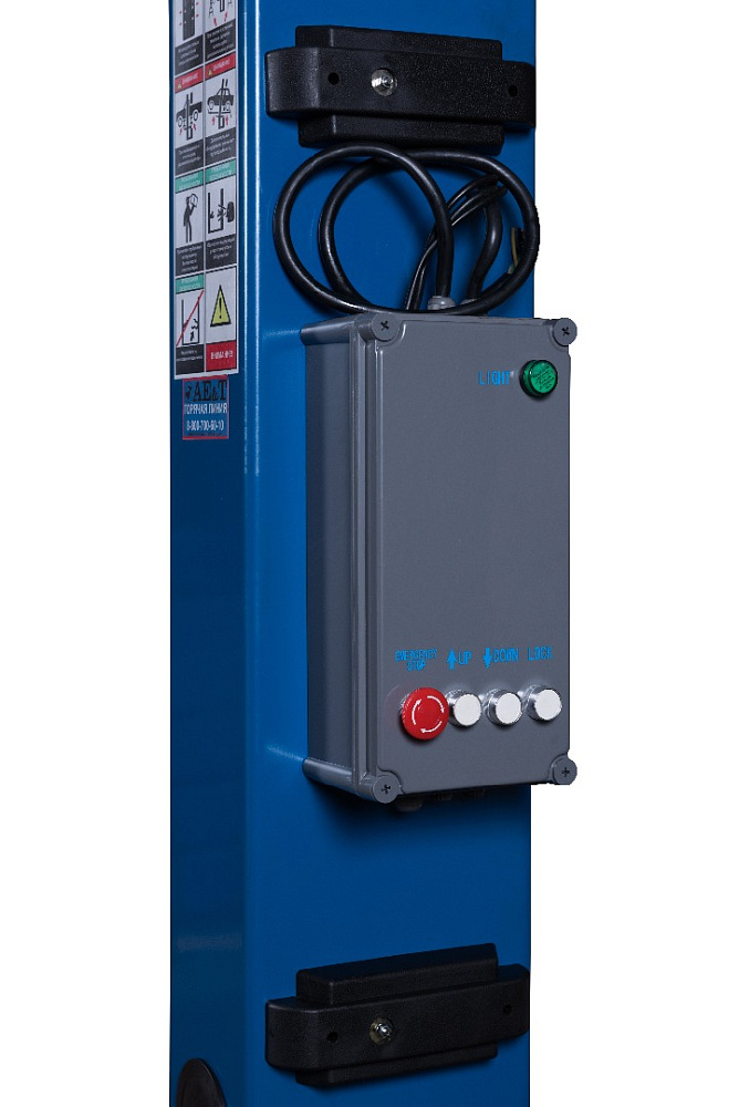 Модель оснащена системой блокировки для предотвращения падения транспортного средства. Подъем, спуск и разблокировка производится централизованно при помощи пульта управления. Для экономии времени при эксплуатации предусмотрена разблокировка одним тросиком для 2-х кареток одновременно. Имеется автоматическое отключение подъема, если а/м упирается в ограничитель сверху.