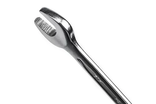Финишная обработка Soft matt и хром никелевое покрытие комбинированного ключа обеспечивает надежную защиту от коррозии, а также надежный хват и препятствует выскальзыванию инструмента из рук. 12-гранный профиль накидной части подходит к головкам болтов и гайкам как 6-, так и 12-гранного профиля, и обеспечивает 5 градусный шаг перехвата. Специальный отгиб, в 15 градусов рожковой либо накидной части ключа позволит работать в местах с ограниченным доступом к крепежу и помогут подобраться к крепежу как с торца, так и с боку, в зависимости от места выполняемых работ.
