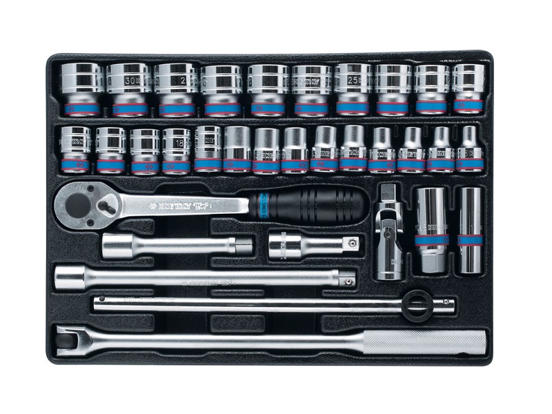 Набор включает в себя широкий ряд торцевых головок, включающий в себя редкие размеры. Два типа воротков: Т-образный и мощный «срывной» вороток длиной 380 мм