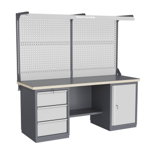 Верстак может комплектоваться одинарным или двойным перфорированным экраном, электромонтажным блоком для установки розеток и дополнительных устройств, а также комплектом освещения с держателем и лампой. Перфорация экрана подходит под стандартные держатели для инструментов, отверток, крючков, полок. Возможна комплектование верстака навесным элементами (держатели, крючки, полки).