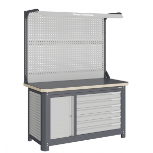 Экран (перфорированная панель) верстака выполнен с квадратной перфорацией 12х12 мм с шагом 38 мм для установки крючков, держателей и других аксессуаров. Экран крепятся к столешнице с помощью специальных кронштейнов. Максимальная масса груза, равномерно распределенного по поверхности экрана, составляет 71 кг.