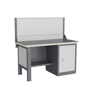 Верстак может комплектоваться одинарным или двойным перфорированным экраном, электромонтажным блоком для установки розеток и дополнительных устройств, а также комплектом освещения с держателем и лампой. Перфорация экрана подходит под стандартные держатели для инструментов, отверток, крючков, полок. Возможна комплектование верстака навесным элементами (держатели, крючки, полки).